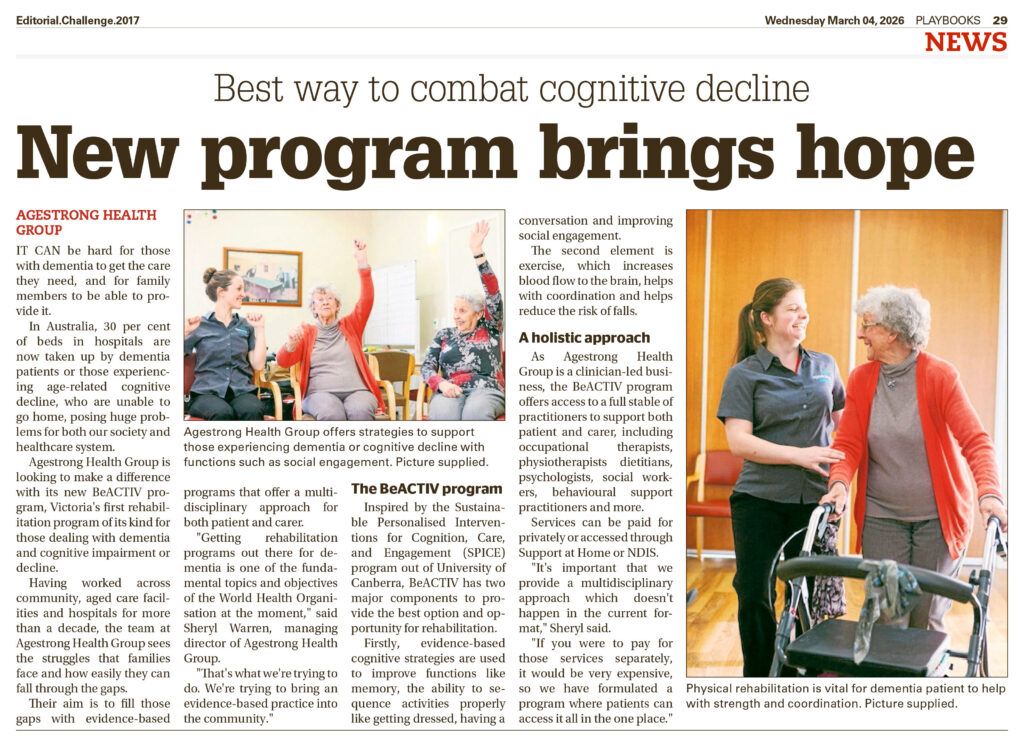 Agestrong Health Group is looking to make a difference with its new BeACTIV program, Victoria’s first rehabilitation program of its kind for those dealing with dementia and cognitive impairment or decline.